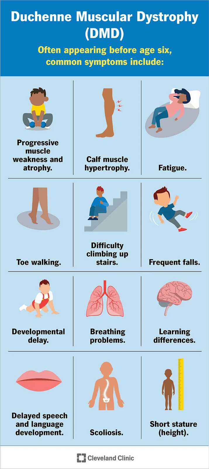 Существует много видов мышечной дистрофии. Симптомы наиболее распространенной разновидности начинаются в детстве, в основном у мальчиков. Другие типы не проявляются до взрослого возраста.